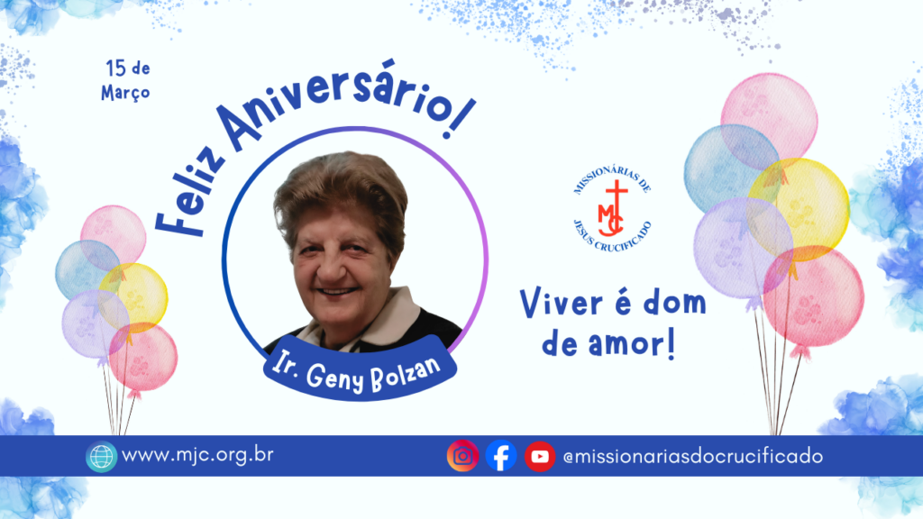 Hoje celebramos com alegria os 90 anos de vida da Irmã Geny Bolzan, Missionária de Jesus Crucificado. Nascida em 15 de março de 1936, em Restinga Sêca/RS, Irmã Geny respondeu generosamente ao chamado de Deus ao ingressar na Congregação em 27 de novembro de 1957, fazendo sua Primeira Promessa em 15 de agosto de 1960.