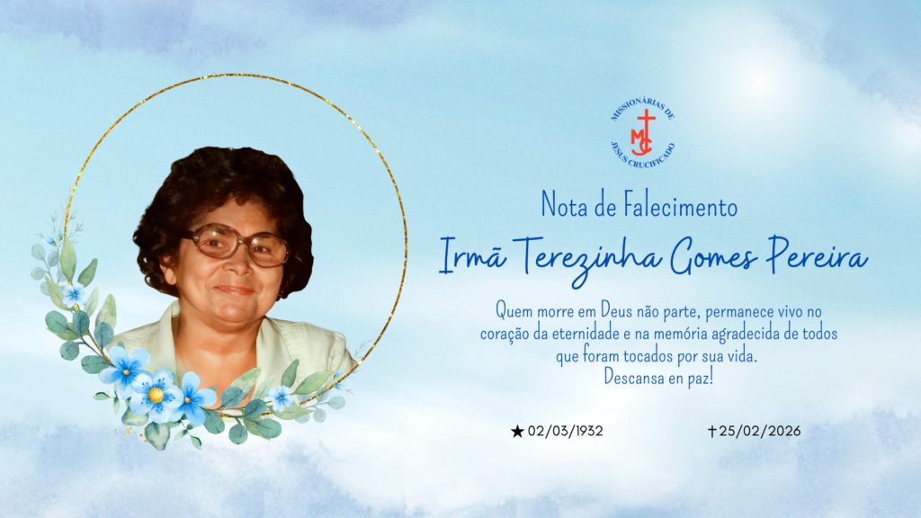 Com pesar e na esperança da Ressurreição, comunicamos o falecimento da querida Irmã Terezinha Gomes Pereira, Missionária de Jesus Crucificado, acontecido no dia 24 de fevereiro de 2026, em Recife/PE, onde residia na Comunidade Nossa Senhora Rainha da Paz.
